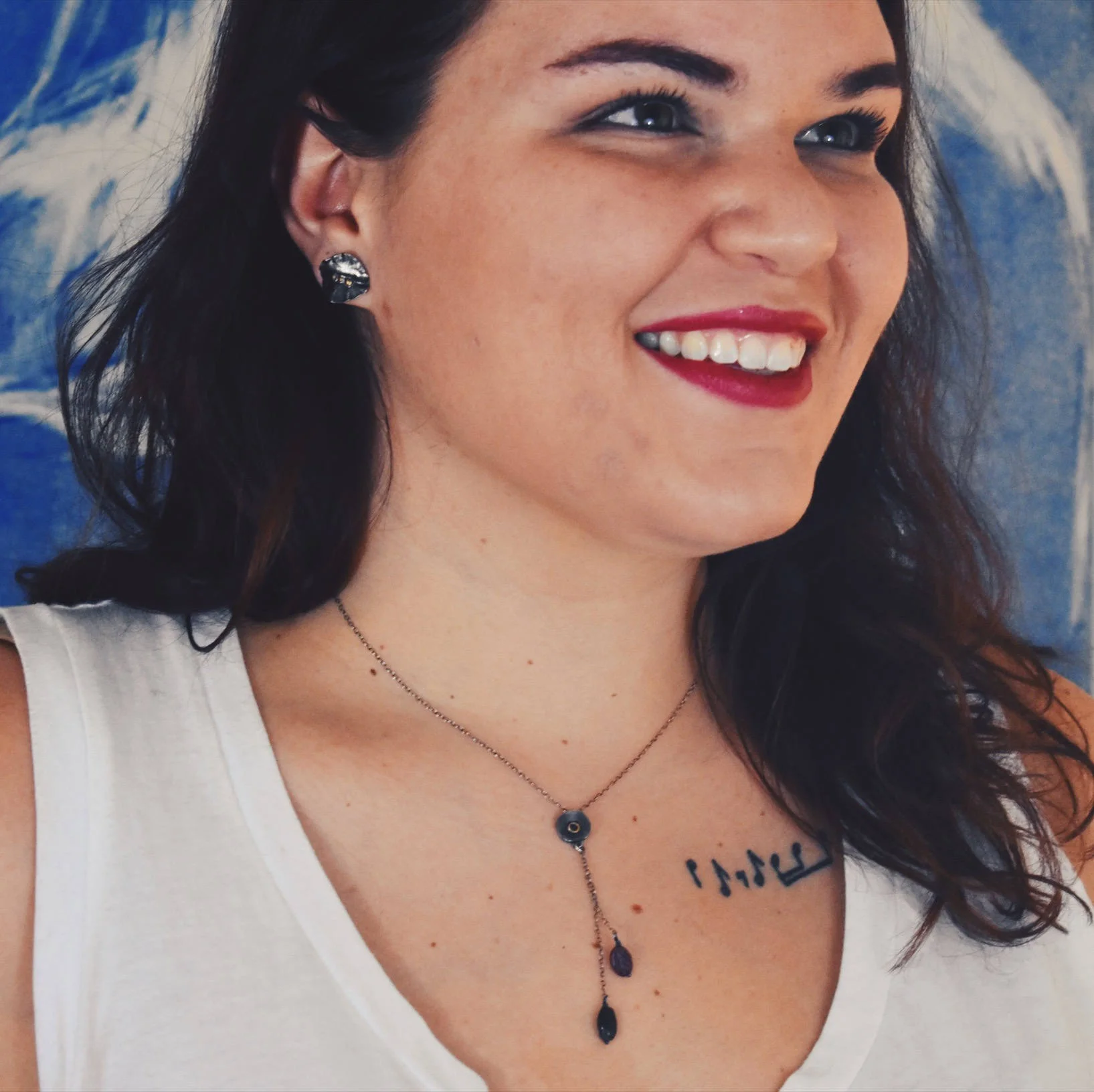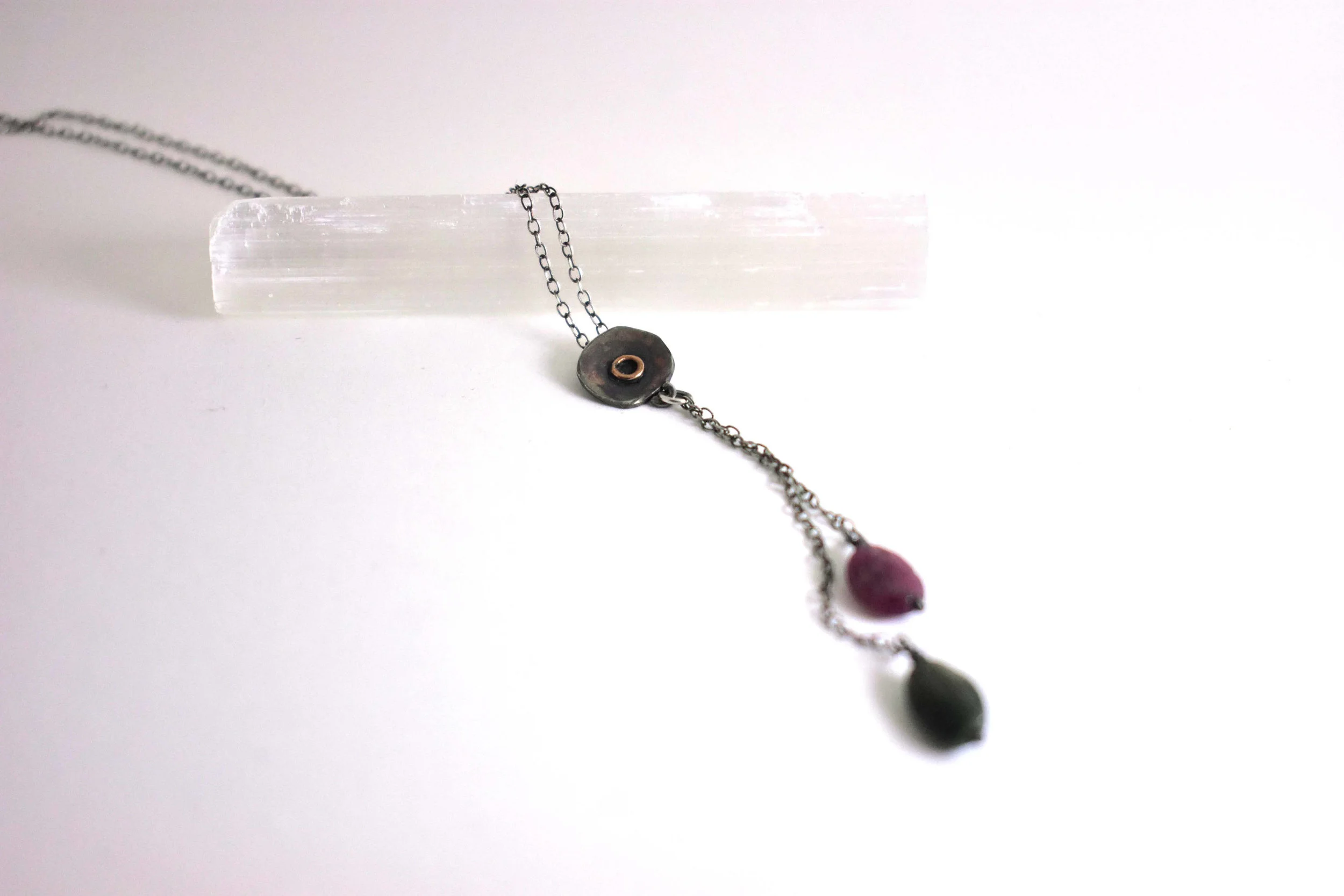 This hand fabricated and patinaed sterling silver necklace features tourmaline drops and a 14k gold filled accent. The chain is 16 inches with a 3 inch drop. It closes with a lobster claw clasp.