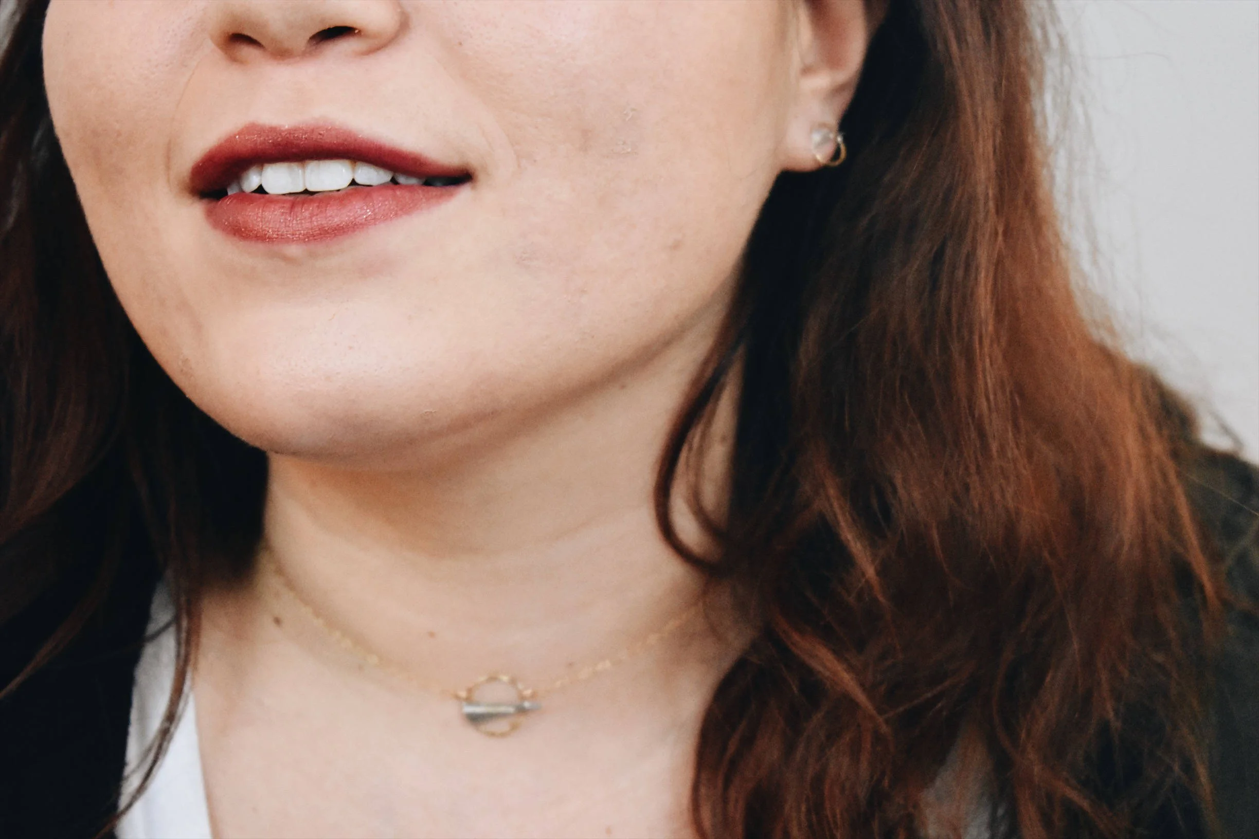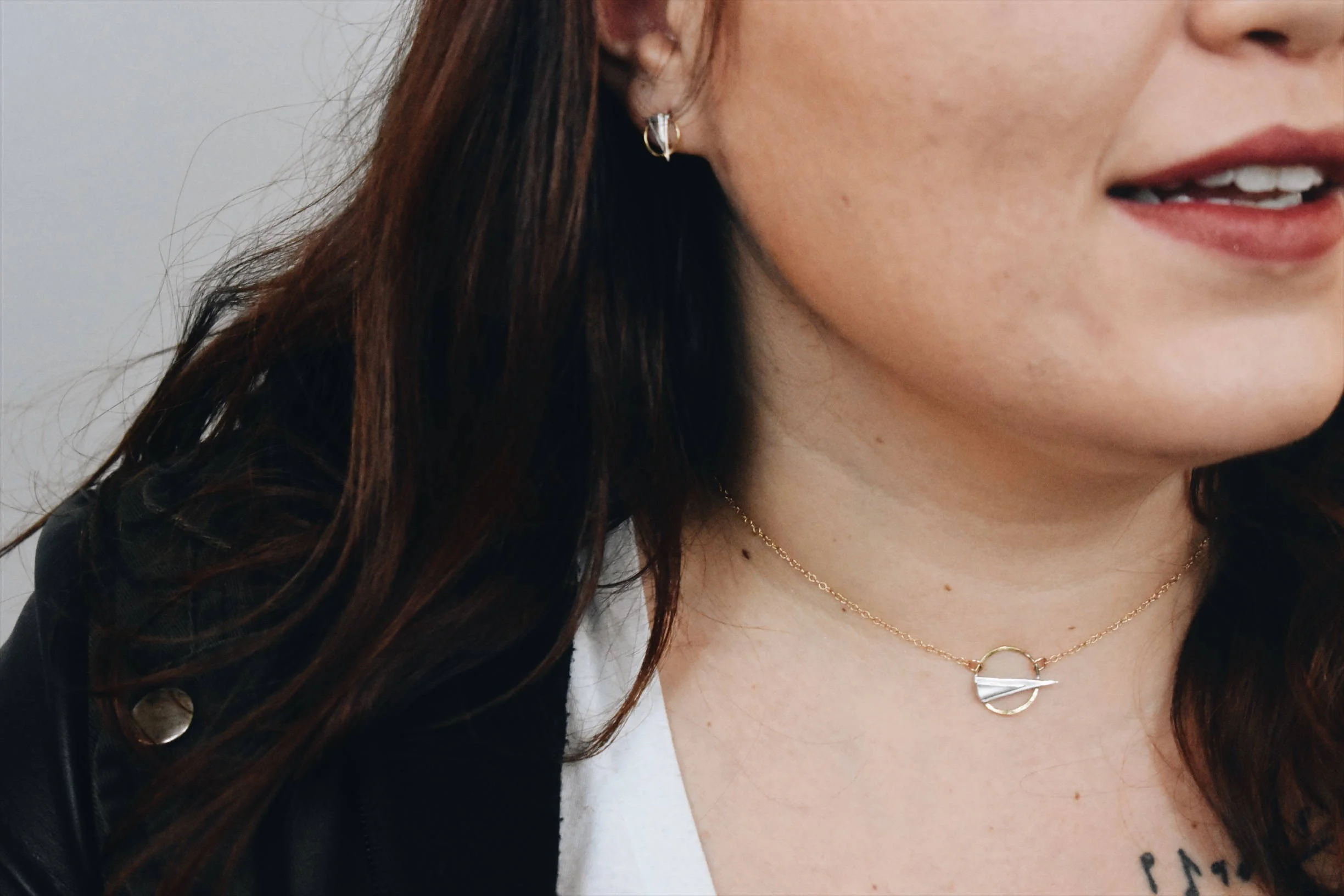 This necklace is sharp and delicate! It's minimalist and a little bit rock and roll and a little bit glam. It's hand fabricated in 14k gold fill and a sterling silver accent. The chain is 14 inches and closes with a lobster claw clasp.